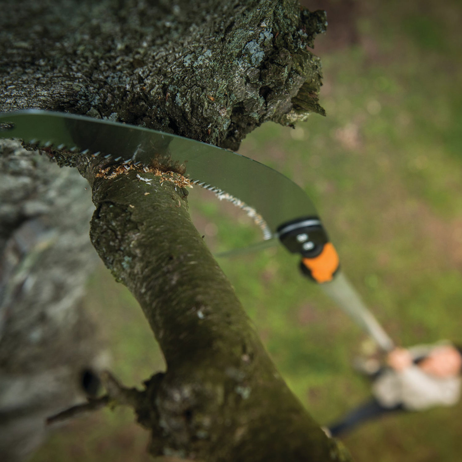 Die Fiskars QuikFit Wertastungssäge eignet sich ideal, wenn Äste an weit entfernten Stellen abgesägt werden müssen. Das Sägeblatt besteht aus gehärtetem Stahl und verfügt zusätzlich über einen Haken sowie ein Stoßmesser. Der Haken sorgt für Stabilität und verhindert das Herausrutschen aus dem Sägeschnitt während der Arbeit. Das Stoßmesser hat die Funktion, die Rinde unterhalb des Astes zu durchtrennen. Außerdem soll es Rindenverletzungen vermeiden. Diese Wertastungssäge eignet sich hervorragend für den Einsatz mit den beiden QuikFit Teleskop-Stielen.