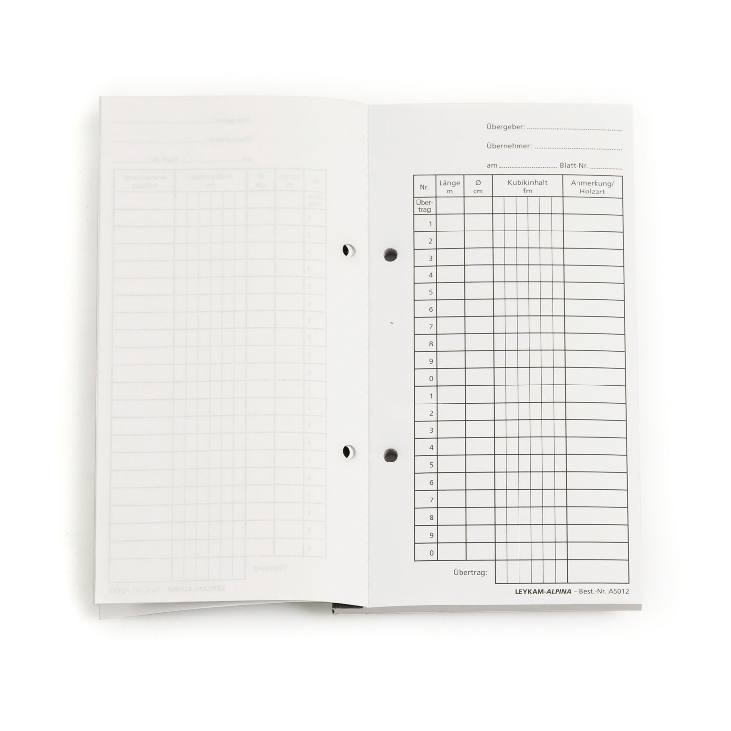 Die Tabelle wird auf Normalpapier gedruckt, ist selbstdurchschreibend und für alle Holzarten geeignet.