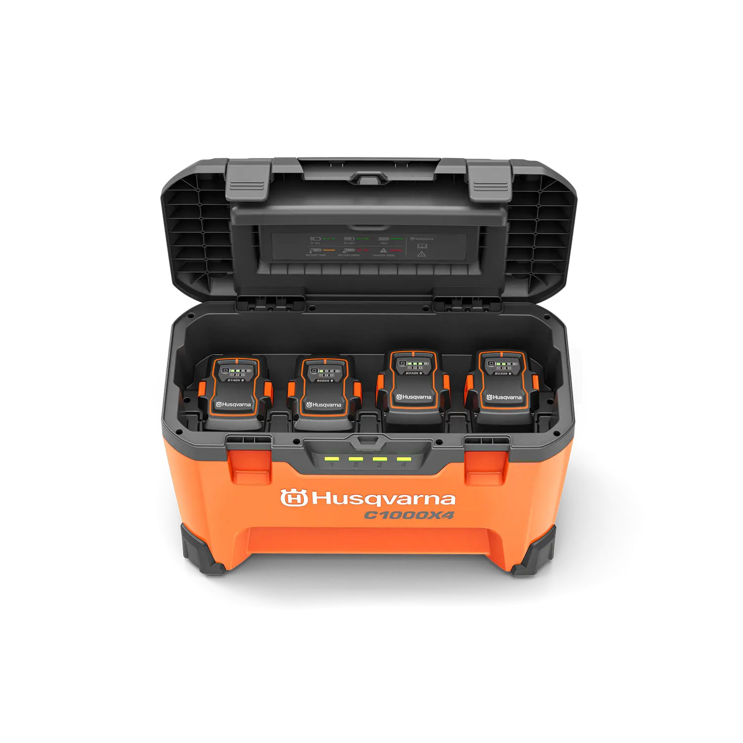 Husqvarna 40-C1000X4 Multi-Rack-Ladebox zum Laden, wo immer du willst - in der Werkstatt, auf der Baustelle, im Auto oder im Anhänger. Die 40-C1000X4 ermöglicht das gleichzeitige Hochleistungsladen (bis zu 1000W) von bis zu vier Husqvarna BLi-X 36V-Akkus in einem Gerät, und dank der intelligenten Lastverteilung werden alle Akkus schnell und effizient geladen. Erfüllt die IPX4-Klassifizierung für Wasserbeständigkeit für den Einsatz unter allen Wetterbedingungen. Ladegerät, Transportbox und Aufbewahrung - die Multi-Rack-Ladebox bietet eine All-in-One Lösung für eine zeitsparende Handhabung der Akkus. Die Akkus sind nicht im Lieferumfang enthalten.