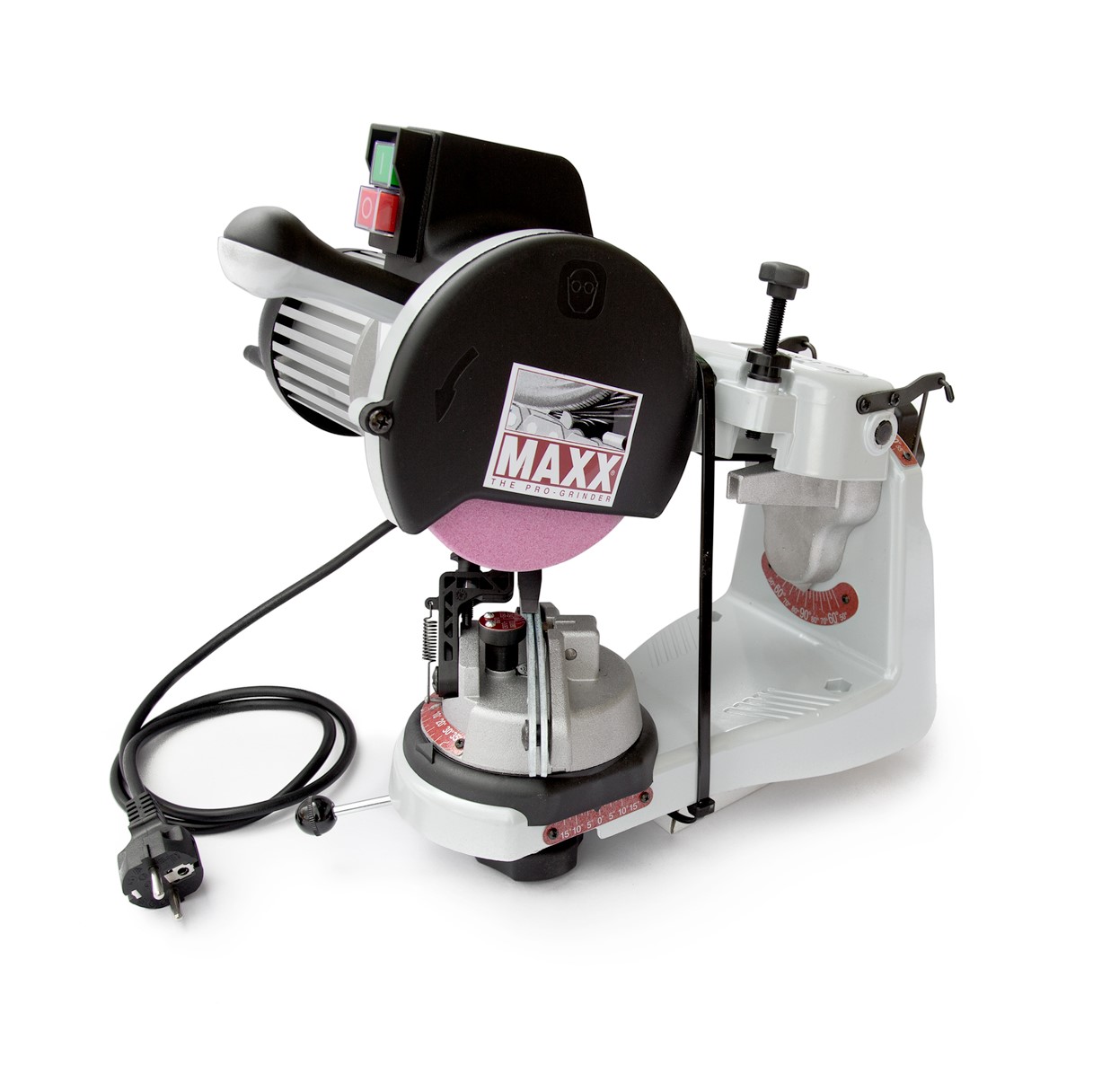 Das elektrische Kettenschärfgerät Maxx eignet sich zum Schärfen von Motorsägeketten aller gängigen Größen (1/4“ - .325“ – 3/8“ - .404“ ). Mit patentierten Lösungen wie der automatischen Einspannung der Kette sowie der Möglichkeit, die linken und rechten Zähne der Kette bei gleicher Drehrichtung zu schleifen sorgt diese Schleifmaschine für ein schnelles und präzises Schärfen. Der Schleifkopf ist zu beiden Seiten schwenkbar, die Beleuchtung der Schleischeibe sorgt für eine bessere Kontrolle. Das Schärfen der Zähne von außen nach innen sorgt für gratfreie, extrem scharfe Ketten. Lieferung inkl. drei Schleifscheiben.
