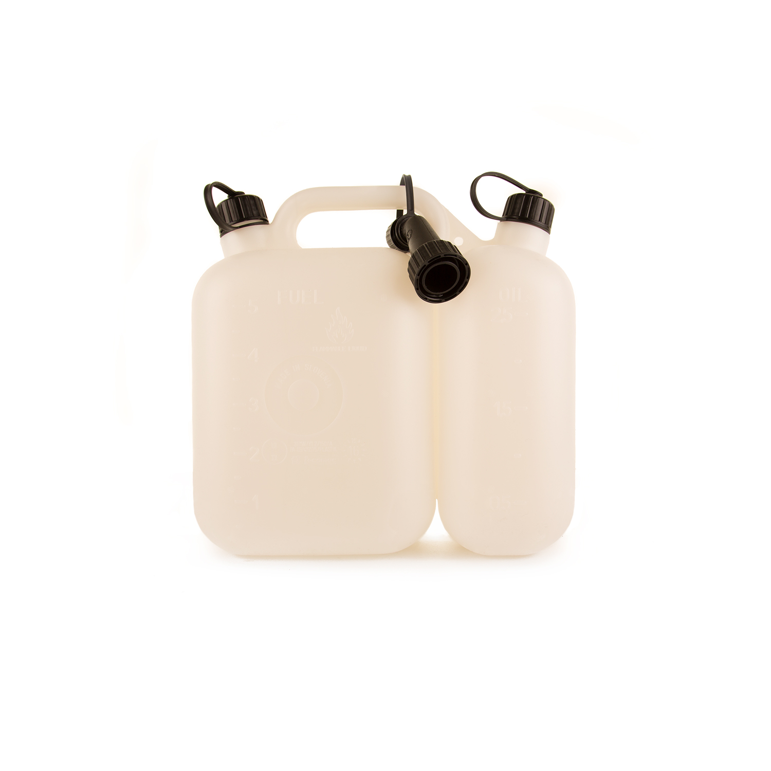 Dieser Kombikanister bietet Platz für 5 Liter Benzin und 2,5 Liter Öl. Im Lieferumfang sind Ausgießer inkludiert.