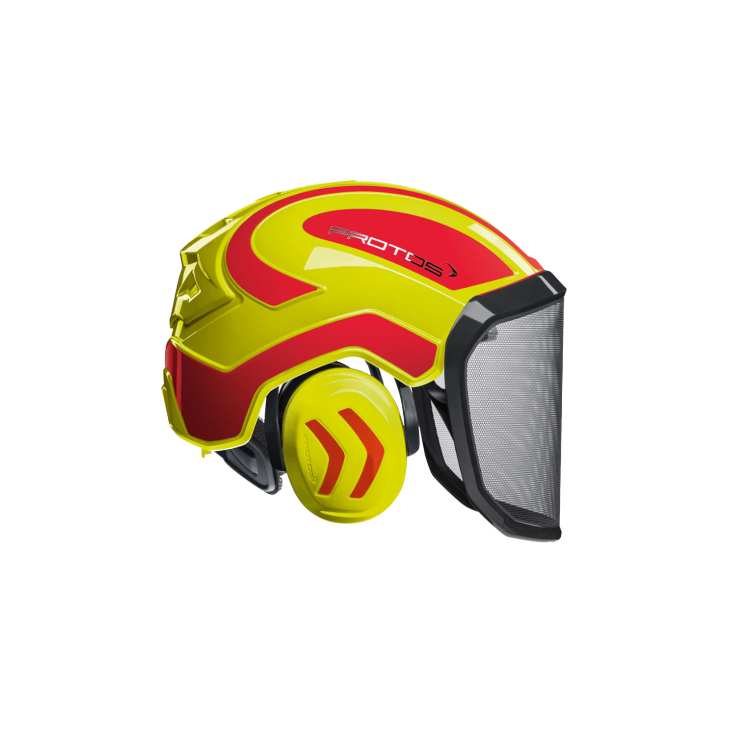 Forst und seine extremen Anforderungen waren und sind die Ausgangslage für die Entwicklung von PROTOS®. Vom Visier bis zum Gehörschutz sind alle Bauteile integral konstruiert und verhindern ein Hängen?bleiben an Ästen, Sträuchern oder Dornen. Auch wenn sich der Gesichts- oder Gehör?schutz in Parkposition befinden, hält PROTOS® perfekt am Kopf.