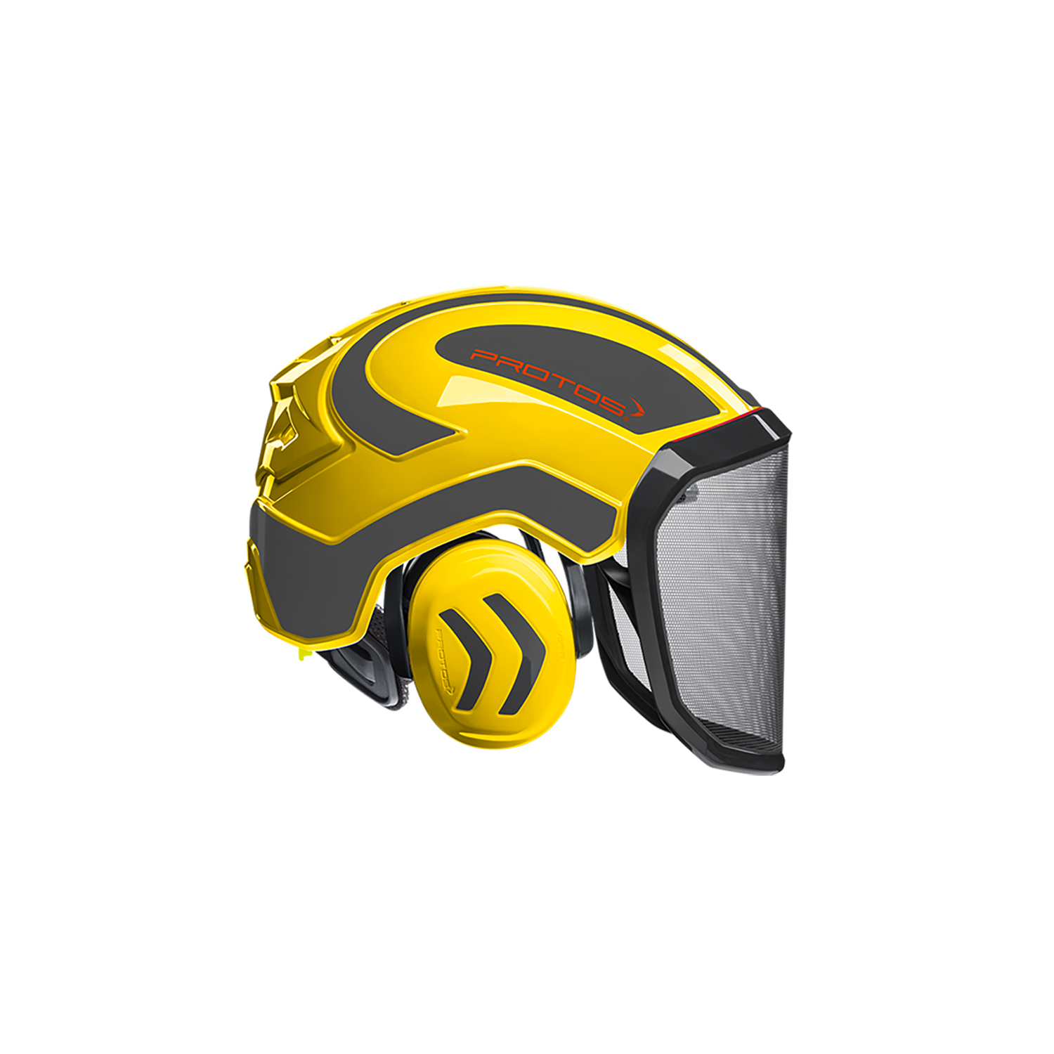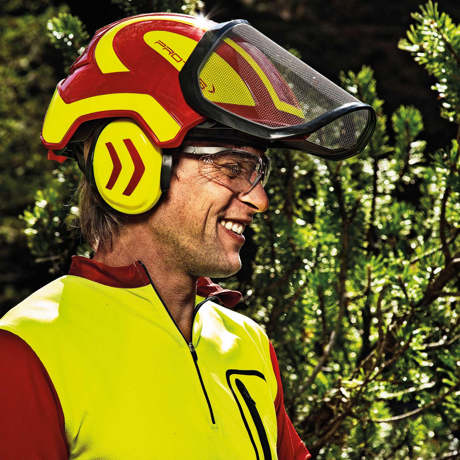 Forst und seine extremen Anforderungen waren und sind die Ausgangslage für die Entwicklung von PROTOS®. Vom Visier bis zum Gehörschutz sind alle Bauteile integral konstruiert und verhindern ein Hängen?bleiben an Ästen, Sträuchern oder Dornen. Auch wenn sich der Gesichts- oder Gehör?schutz in Parkposition befinden, hält PROTOS® perfekt am Kopf.