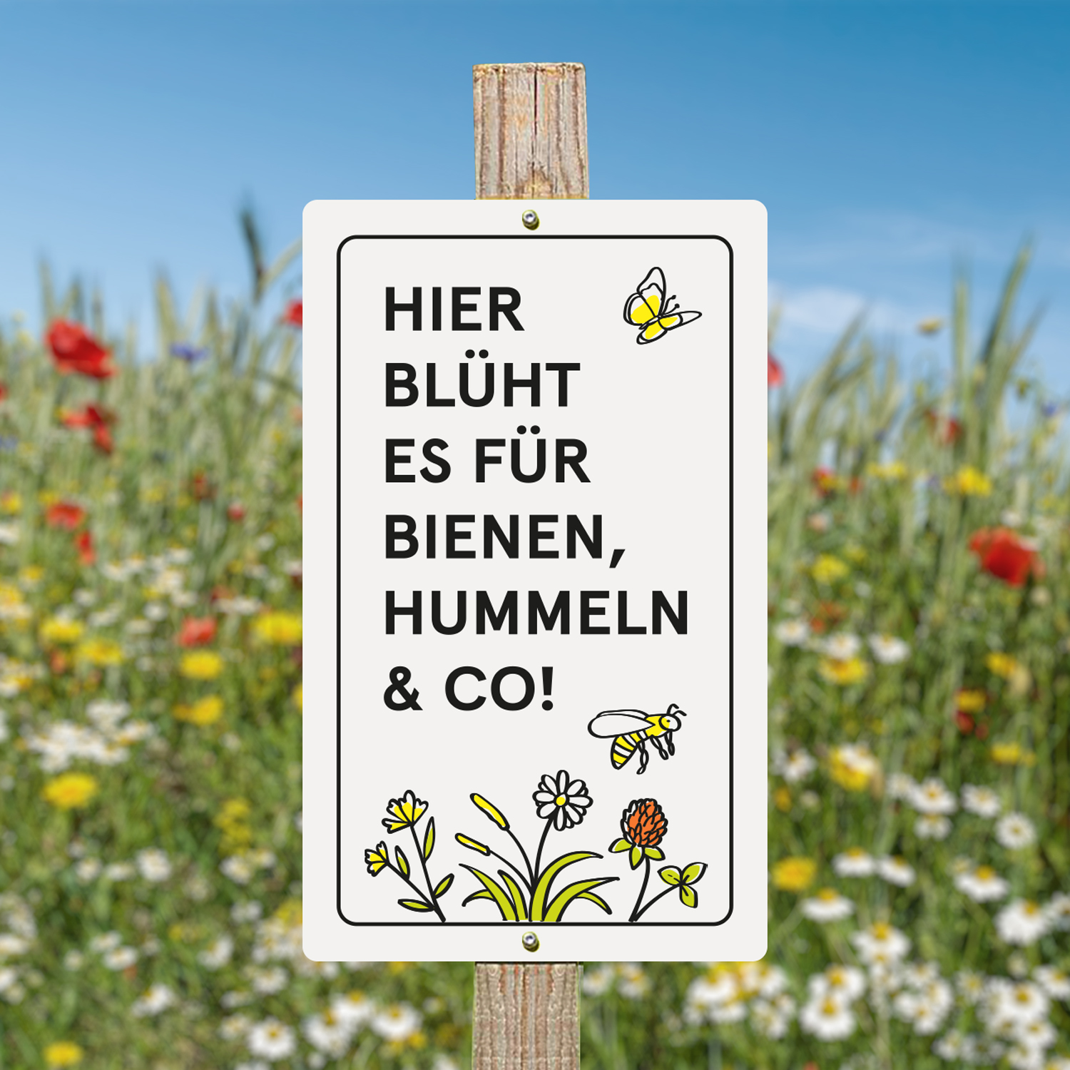 Mit diesem Hinweisschild wird auf Blühstreifen, Blumenwiesen oder andere bunte Flächen aufmerksam gemacht und zugleich Bewusstsein für die Themen Insektensterben und Artenvielfalt geschaffen.