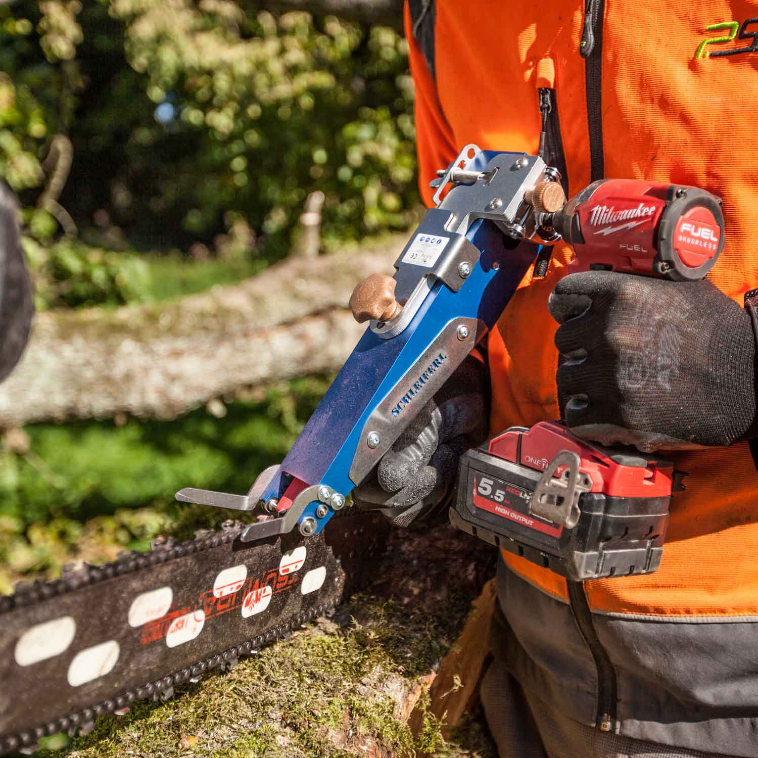 Die Schneidezähne und Tiefenbegrenzer werden mit diesem Schärfgerät gleichzeitig in einem Arbeitsgang gefeilt. Der Wechsel vom rechten zum linken Zahn erfolgt durch Wenden des Gerätes, wofür kein Umbau erforderlich ist. Im Lieferumfang sind Schärfgerät, Tiefenbegrenzerfeile und zwei Rundfeilen enthalten.