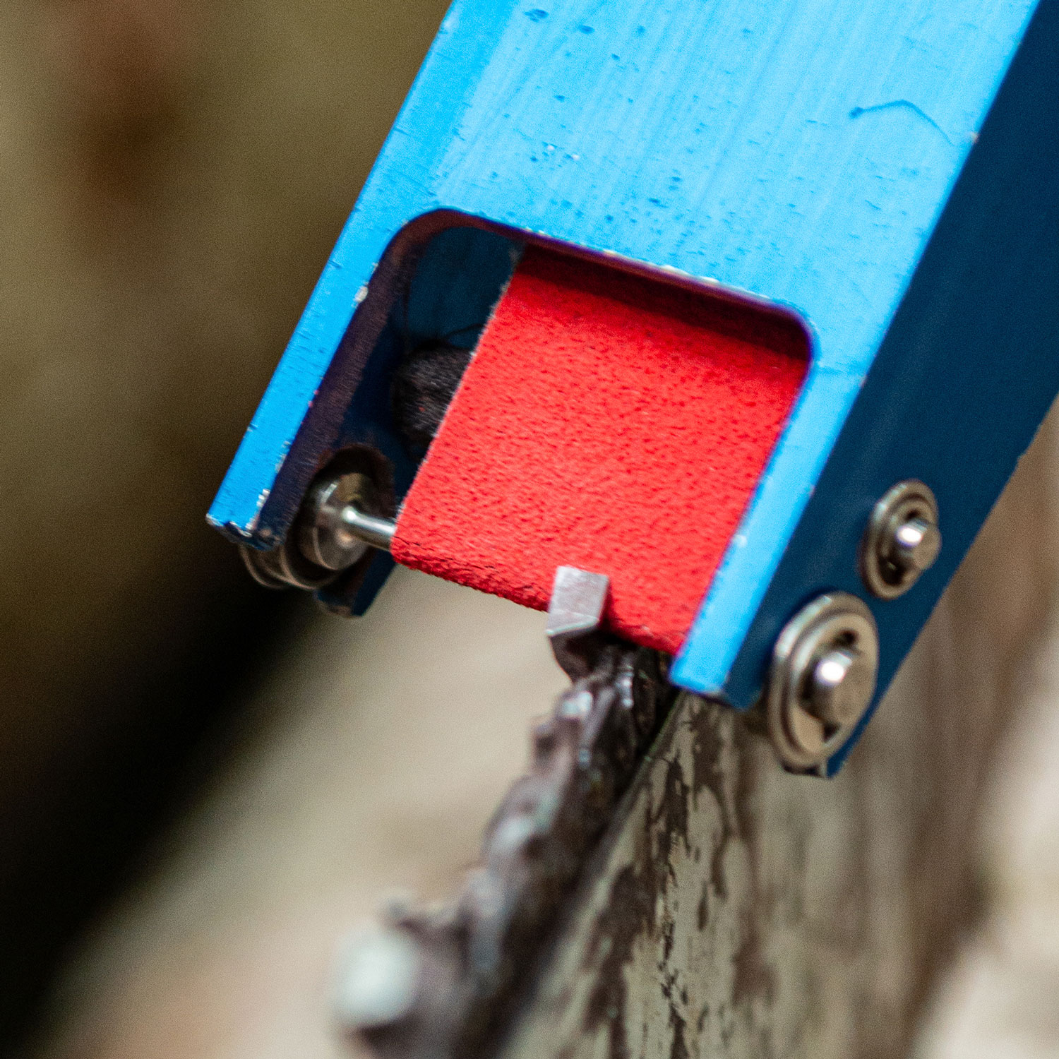 Die Schneidezähne und Tiefenbegrenzer werden mit diesem Schärfgerät gleichzeitig in einem Arbeitsgang gefeilt. Der Wechsel vom rechten zum linken Zahn erfolgt durch Wenden des Gerätes, wofür kein Umbau erforderlich ist. Im Lieferumfang sind Schärfgerät, Tiefenbegrenzerfeile und zwei Rundfeilen enthalten.