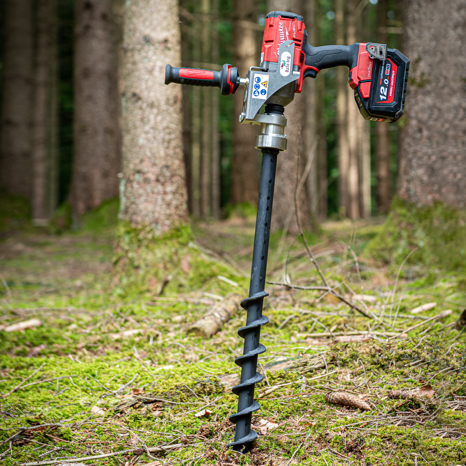 Der DrillFast von BaSt-Ing ist der erste Erdbohrer, der mit einem leistungsstarken Schlagschrauber angetrieben wird. Mit ihm lassen sich Containerpflanzen als auch wurzelnackte Pflanzen fachgerecht und wirtschaftlich setzen. Auch im Zaunbau findet der DrillFast Anwendung. Fixiert wird der DrillFast über den bereits bekannten ValLink. Im Gegensatz zu jedem anderen Erdbohrgerät mit einem festen Getriebe, bekommt man bei der Benutzung des DrillFast keine Drehmoment-Stöße ab. Der DrillFast dreht im Leerlauf 2000 Umdrehungen. Wenn ein Widerstand kommt, dann setzt das Schlagwerk ein, der die Widerstände zur Seite klopft. Man hat keinen großen Ermüdungseffekt und kann innerhalb einer Stunde bis zu 100 Pflanzen setzen. Je nach Bodengegebenheiten braucht man dabei eine hohe Akku-Kapazität (10 Ah pro 100 Pflanzen). Regelmäßiges Nachladen ist bei einer längeren Benutzung also notwendig.