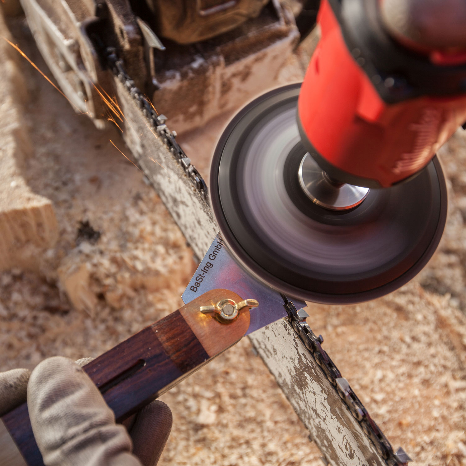 Mit dem Tiefenbegrenzer-Schleiferl können die Räume bzw. Tiefenbegrenzer genau passend auf den Sägezahn angepasst werden. Einfach die Schmiege auf den Sägezahn legen und mit dem Schlagschrauber den Tiefenbegrenzer mit der Spezial-Fächerscheibe auf die passende Höhe zurücksetzen. Einfacher, schneller und präziser ist es kaum möglich die Tiefenbegrenzer auf die korrekte Höhe zu trimmen.