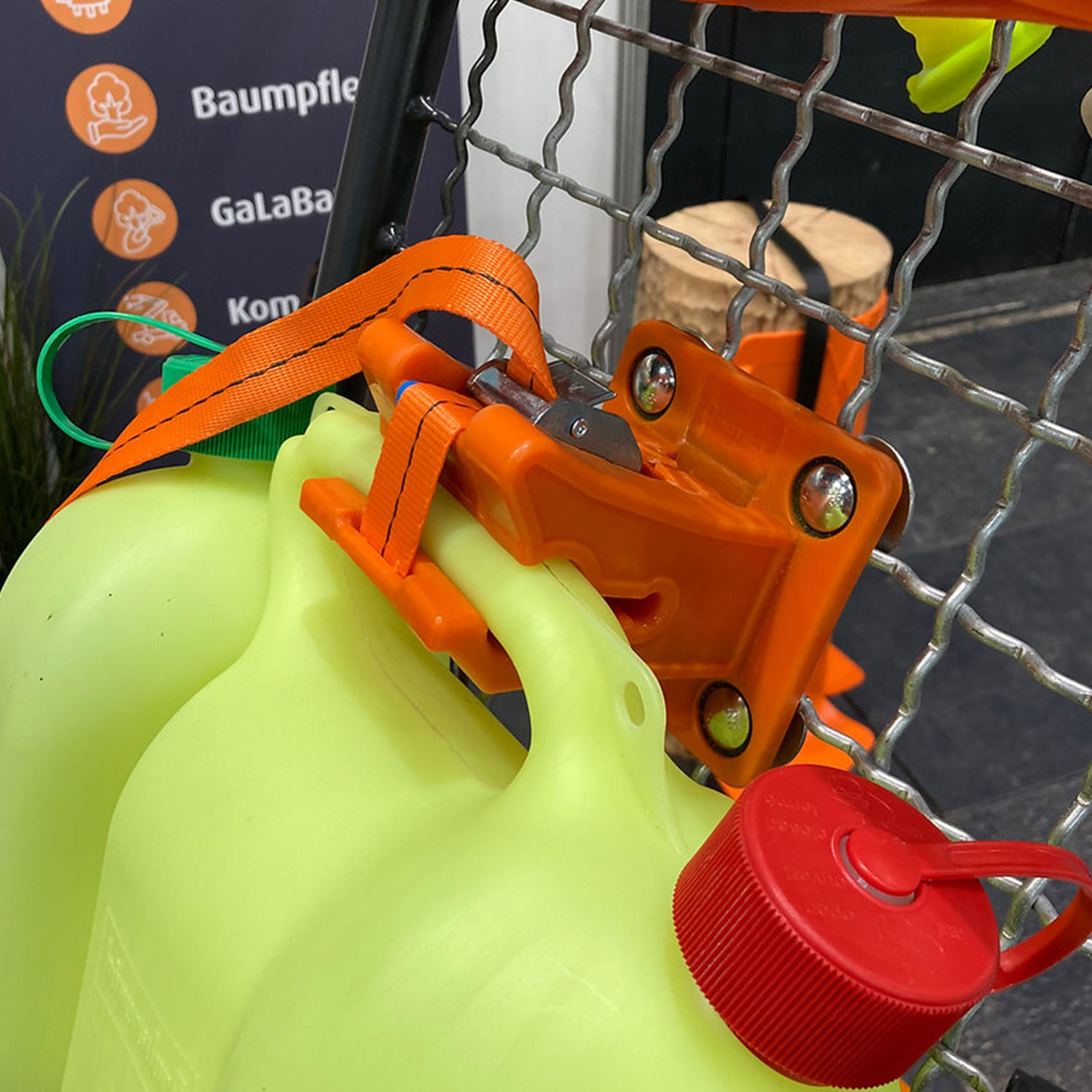 Universeller Kanisterhalter für alle gängigen Qualitäts-, Kombi- und Treibstoffkanister in Profiforst und Baumpflege.