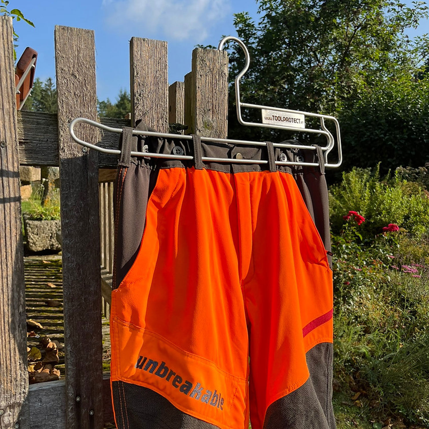 Neuartiges, extrem robustes Ablagesystem für deine persönliche Schutzausrüstung. Mit wenigen Handgriffen hängt deine Schutzhose am Bügel, ohne dabei durchzuhängen.