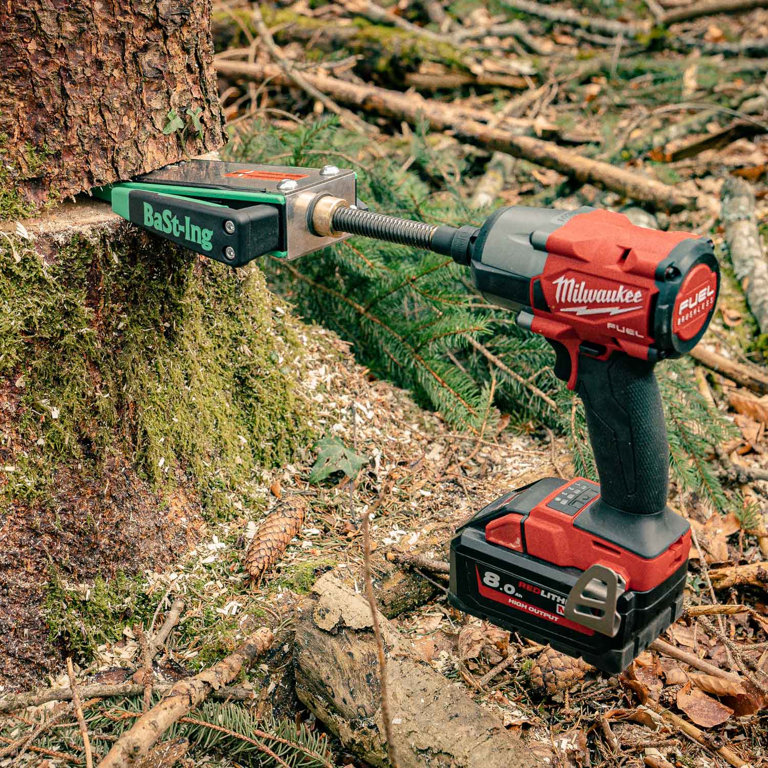 Der ValFix darf mit maximal 700 Nm-Schlagschrauber betrieben werden. Mit der passenden Spannklemme lassen sich Schlagschrauber und ValFix fest verbunden als Fälleinheit im Wald tragen.