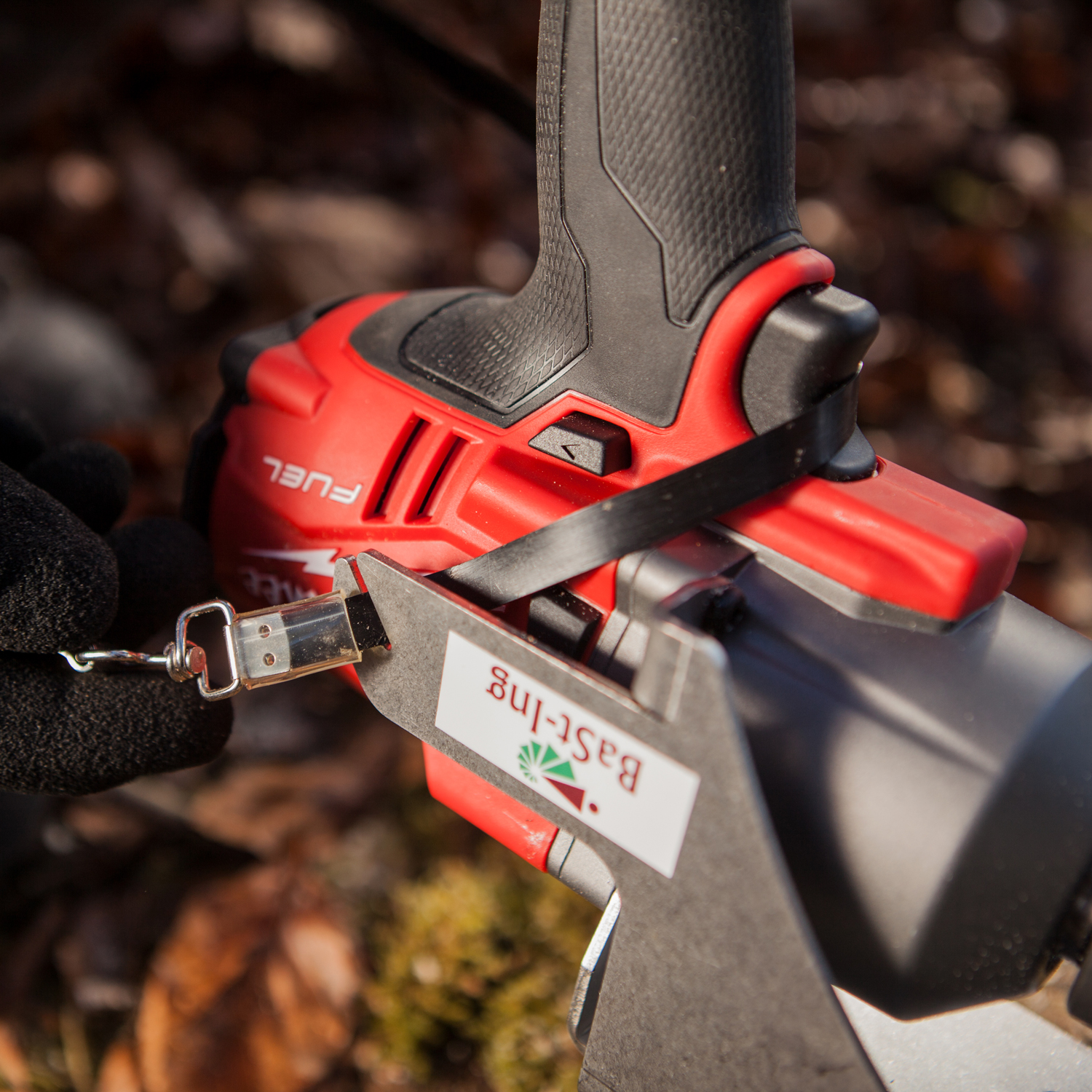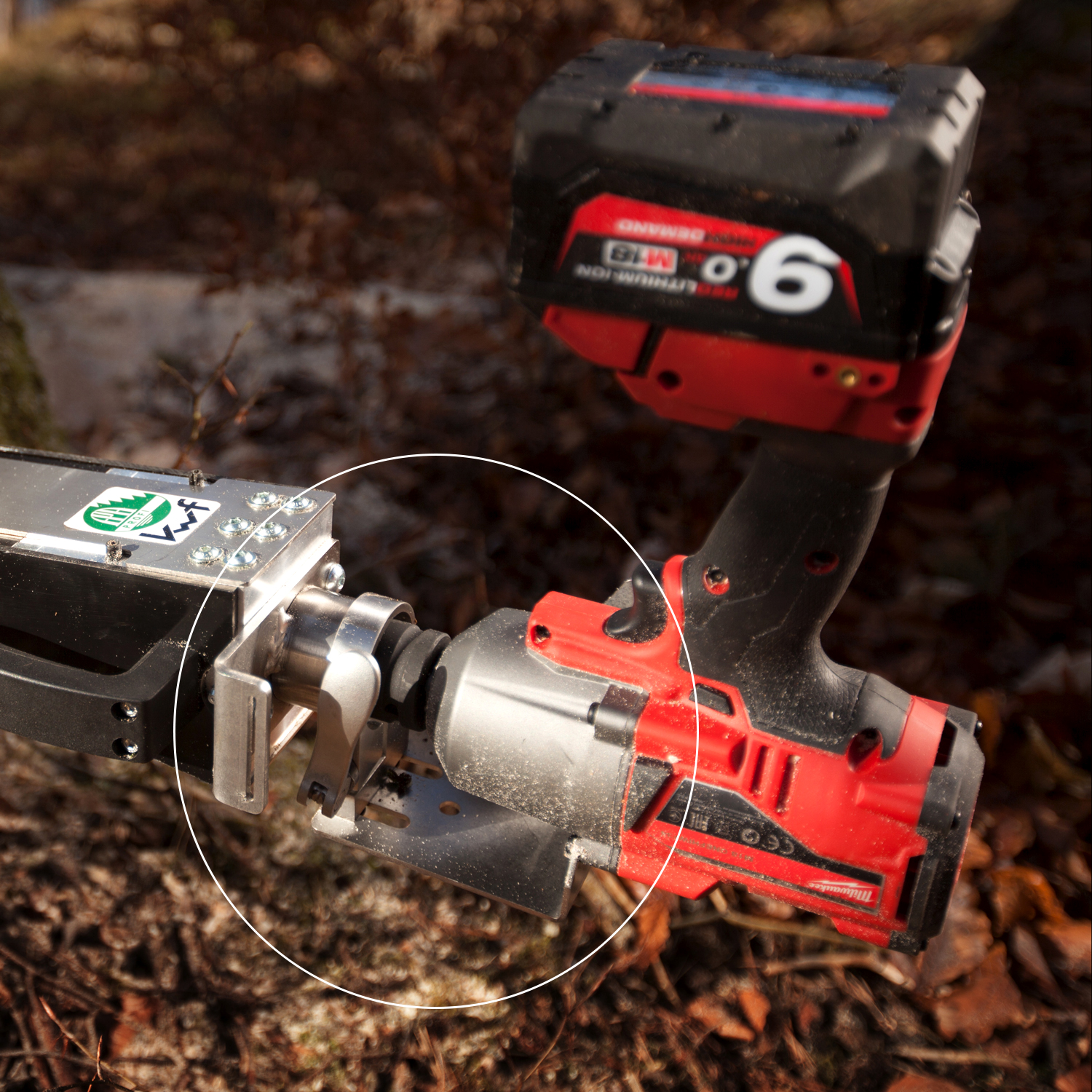 Der ValLink von BaSt-Ing ist ein cleveres Verbindungsstück, das bei der Benutzung vom ValFast Fällkeil als auch beim DrillFast Erdbohrer seinen Einsatz findet. Einfach auf den Schlagschrauber geschraubt, werden Schlagschrauber und ValFast oder DrillFast mittels eines Exzenterspanners verbunden. Durch das Lösen von zwei Schrauben kann die Klemmverbindung auch einfach wieder abgenommen werden. Verwendet man den ValLink in Kombination mit dem ValFast Fällkeil lässt sich dieser einfach mit einem Forstmaßband ansteuern, wodurch man beim Fällen des Baumes einige Meter Rückweiche einnehmen kann. Am Stamm herabfallende Äste stellen somit weniger Gefahr dar. In Kombination mit dem DrillFast hat man in Sekundenschnelle ein praktisches Pflanzwerkzeug bei der Hand, das schnelles und wirtschaftliches Setzen von Pflanzen ermöglicht.