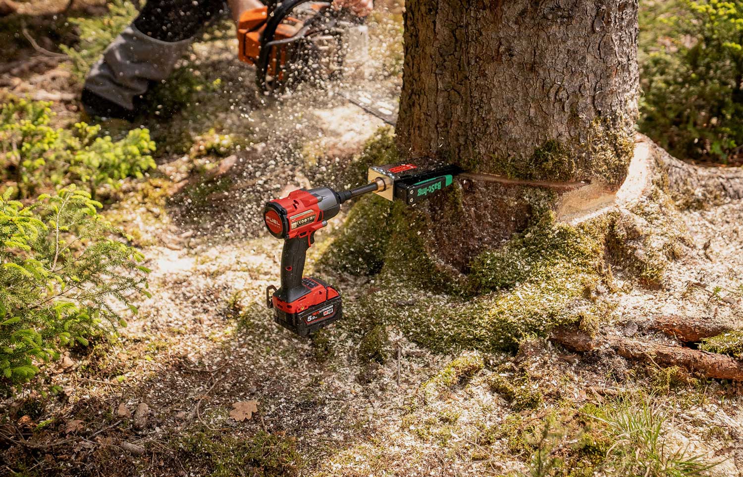 Der ValLink von BaSt-Ing ist ein cleveres Verbindungsstück, das bei der Benutzung vom ValFast Fällkeil als auch beim DrillFast Erdbohrer seinen Einsatz findet. Einfach auf den Schlagschrauber geschraubt, werden Schlagschrauber und ValFast oder DrillFast mittels eines Exzenterspanners verbunden. Durch das Lösen von zwei Schrauben kann die Klemmverbindung auch einfach wieder abgenommen werden. Verwendet man den ValLink in Kombination mit dem ValFast Fällkeil lässt sich dieser einfach mit einem Forstmaßband ansteuern, wodurch man beim Fällen des Baumes einige Meter Rückweiche einnehmen kann. Am Stamm herabfallende Äste stellen somit weniger Gefahr dar. In Kombination mit dem DrillFast hat man in Sekundenschnelle ein praktisches Pflanzwerkzeug bei der Hand, das schnelles und wirtschaftliches Setzen von Pflanzen ermöglicht.